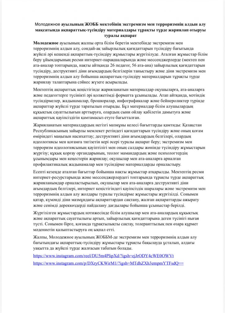 Молодежное ауылының ЖОББ мектебінің экстремизм мен терроризмнің алдын алу мақсатында ақпараттық-түсіндіру материалдары тұрақты түрде жариялап отыруы туралы ақпарат