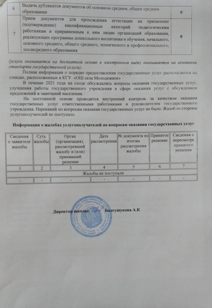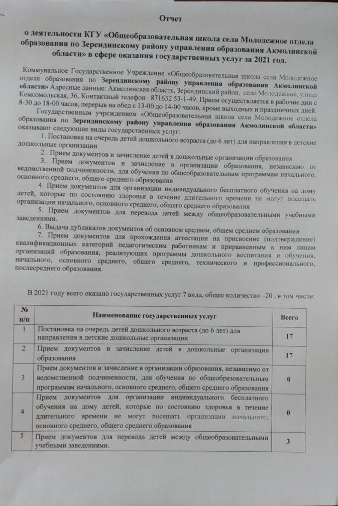 Отчет о деятельности КГУ "Общеобразовательная школа села Молодежное отдела образования по Зерендинскому району управления образования Акмолинской области" в сфере оказания государственных услуг за 2021 год.