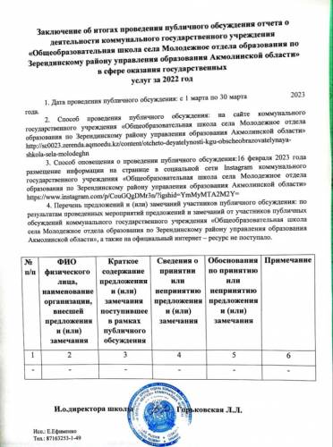 Заключение об итогах проведения публичного обсуждения отчета о деятельности коммунального государственного учреждения «Общеобразовательная школа села Молодежное отдела образования по Зерендинскому району управления образования Акмолинской области» в сфере оказания государственных услуг за 2022 год